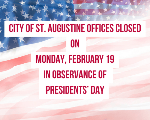 Offices for the City of St. Augustine will be closed on Monday, February 19, in observance of the Presidents’ Day holiday, but solid waste collections will remain on their regular schedule.