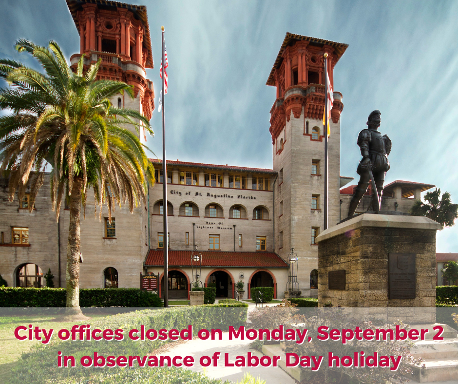 Offices for the City of St. Augustine will be closed on Monday, September 2, 2024, in observance of the Labor Day holiday, but solid waste collections will remain on their regular schedule.