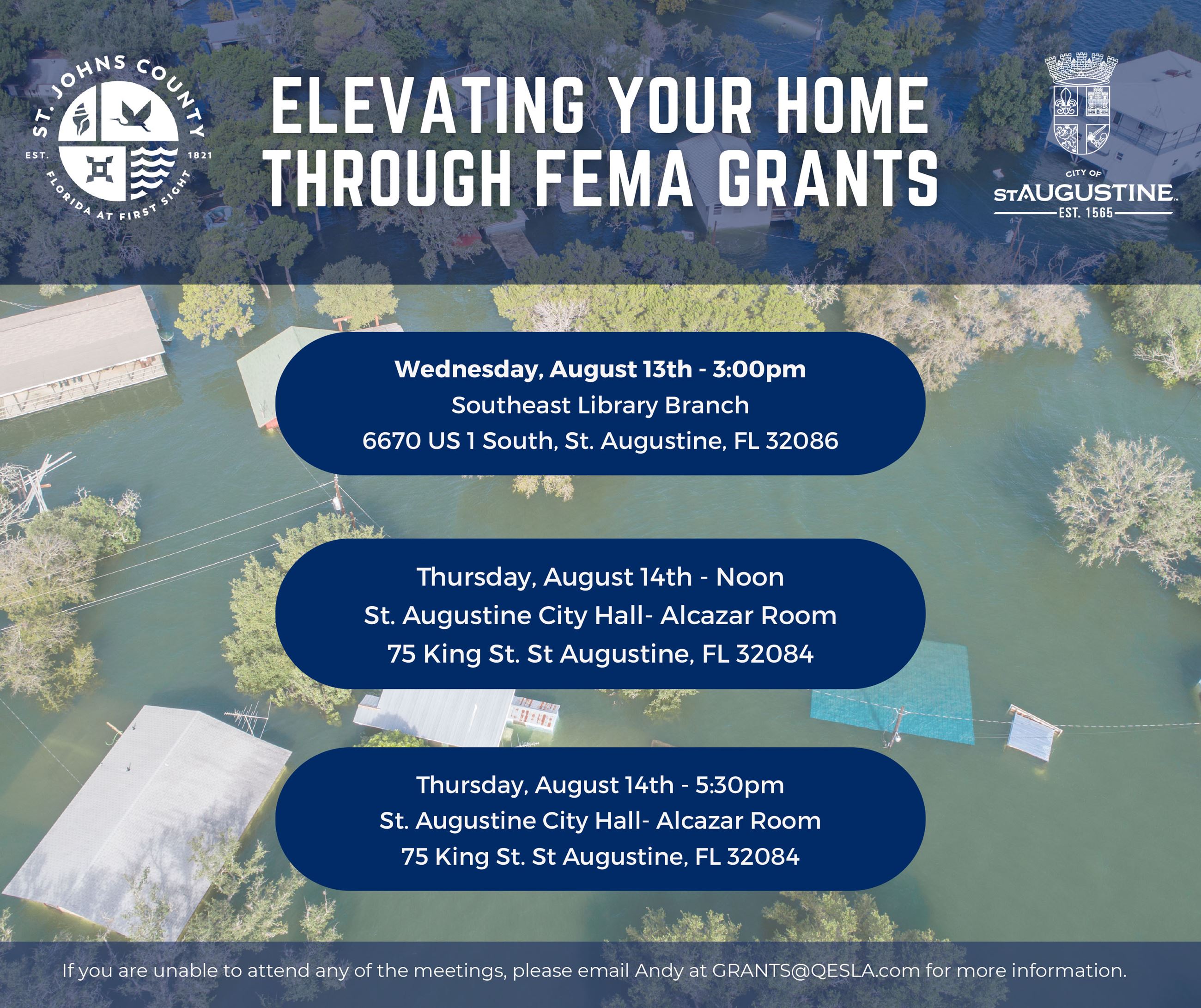 The City of St. Augustine and St. Johns County, in coordination with their consultant, Quality Engineering and Surveying (QES), LLC, will offer three homeowner outreach meetings for residents interested in participating in the 2025 Federal Emergency Management Agency (FEMA) Flood Mitigation Assistance (FMA) funding application submittal.