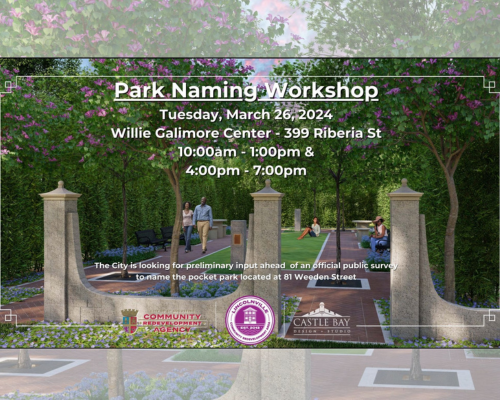 The City of St. Augustine will host a public park naming workshop on Tuesday, March 26 at the Willie Galimore Center (399 Riberia St). The City will offer two sessions that day: one from 10:00am-1:00pm and another from 4:00pm-7:00pm.