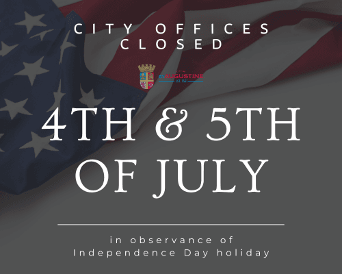 Offices for the City of St. Augustine will be closed on Thursday, July 4, 2024, and Friday, July 5, in observance of the Independence Day holiday, but solid waste collections will remain on their regular schedule.