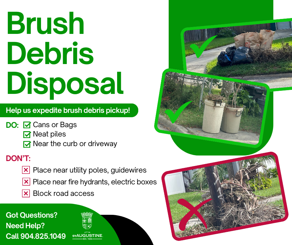 Following the local impacts of Hurricane Helene, the City of St. Augustine Solid Waste Division will deploy additional manpower on citywide residential brush collections to gather all remaining yard debris that is properly disposed of curbside.
