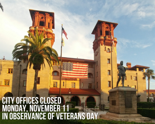 Offices for the City of St. Augustine will be closed on Monday, November 11, 2024, in observance of the Veterans Day holiday, and the City Commission meeting will be held on Tuesday, November 12.