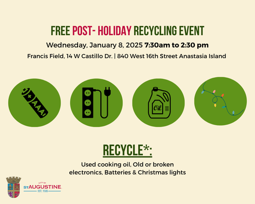 On Wednesday, January 8, 2025, in conjunction with St. Johns County Utilities, the City of St. Augustine will host a special community recycle event from 7:30am-2:30pm at two convenient drop points: 25 W. Castillo Drive (Francis Field downtown) and at 840 West 16th Street on Anastasia Island, behind the SJC Parks and Recreation Office.